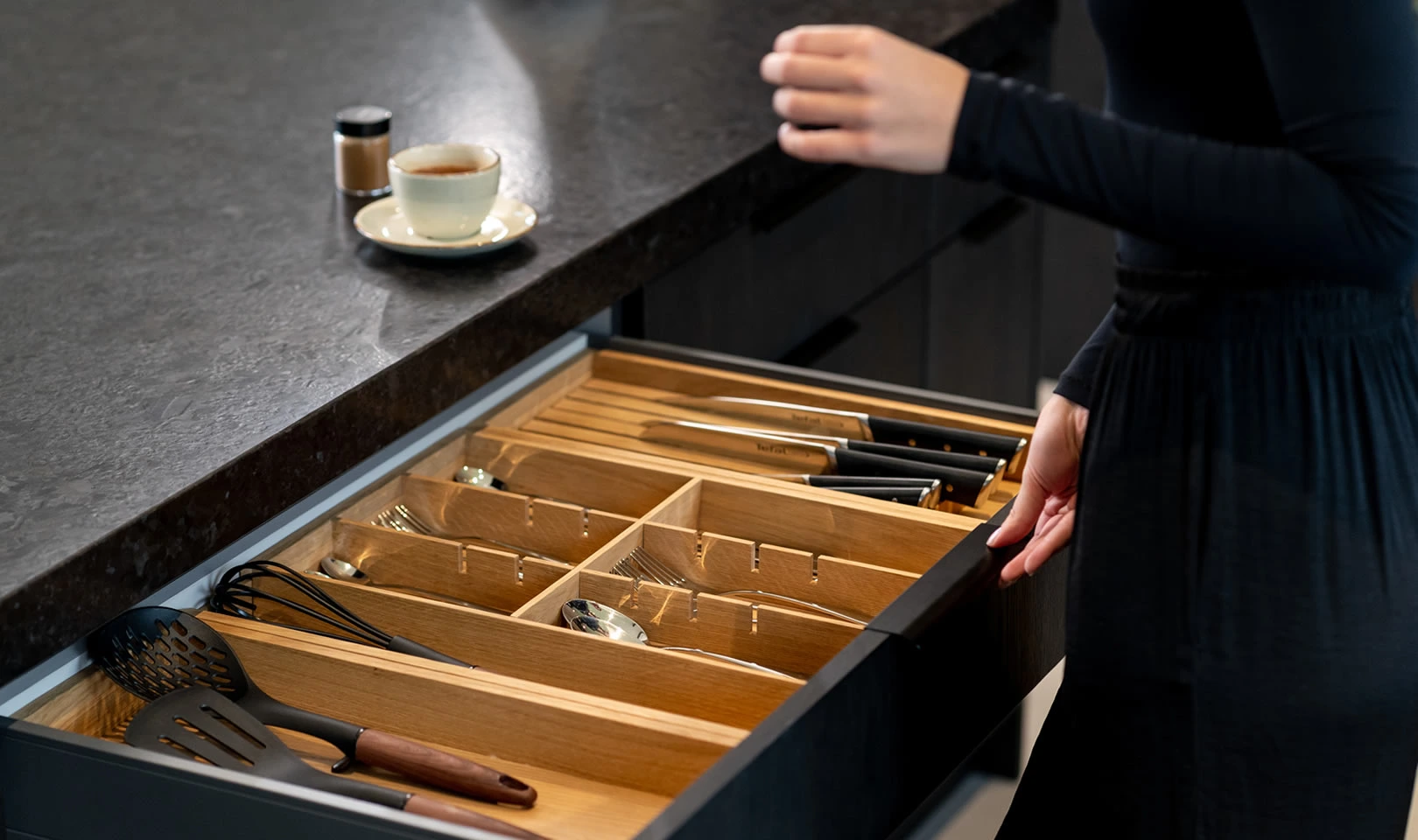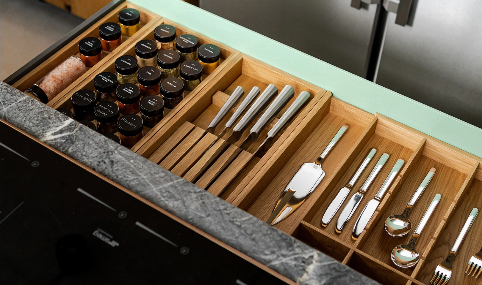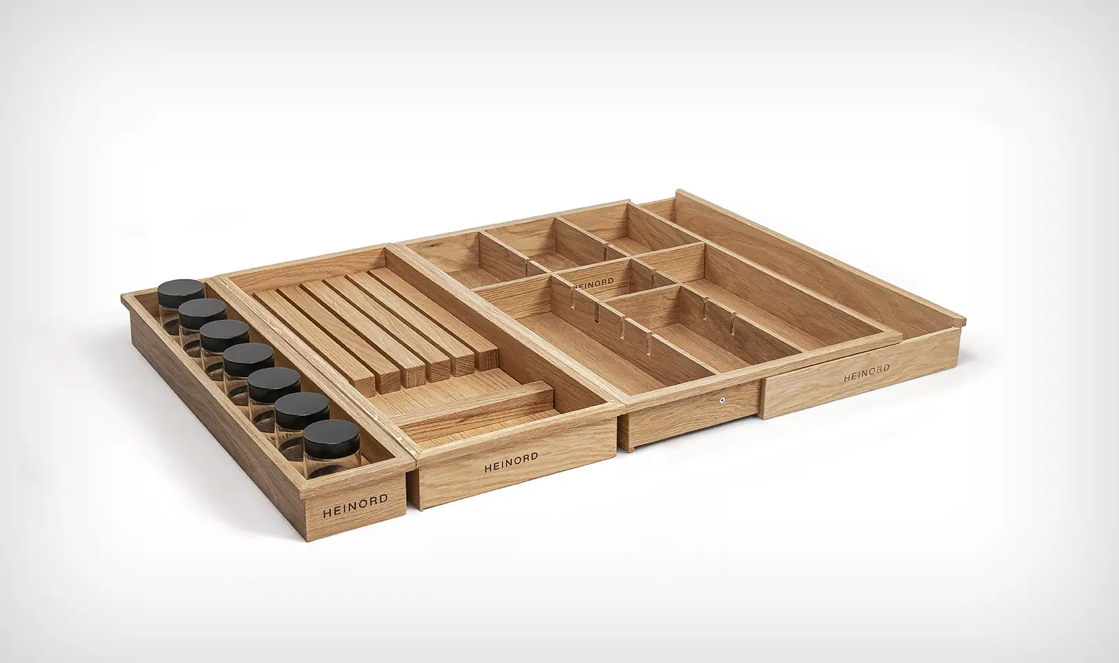 Es gibt viele Küchenschubladen-Organizer, aber natürliches, massives Eichenholz ist ein einzigartiges Material in diesem Segment.