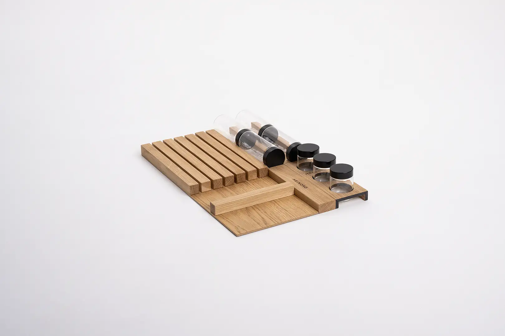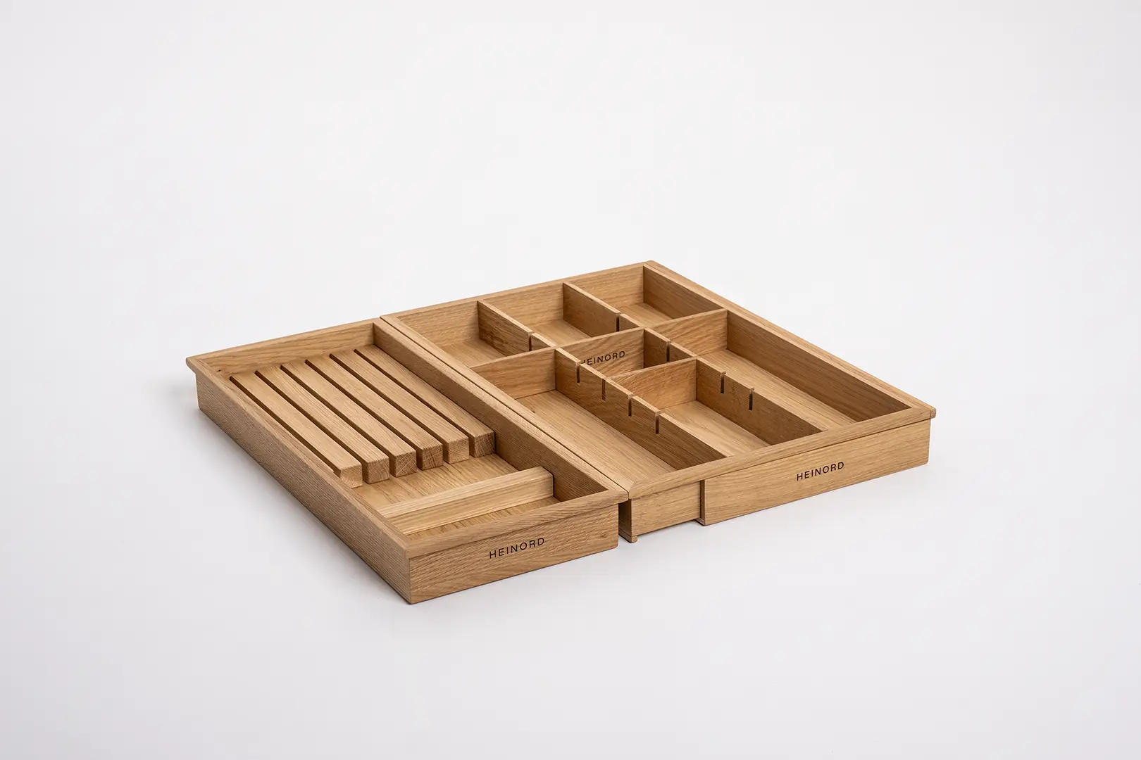 Praktischer und eleganter Messer-Organizer aus natürlichem Eichenholz. Passt perfekt in die Schublade, hilft, Ordnung zu halten und Messer sicher aufzubewahren.